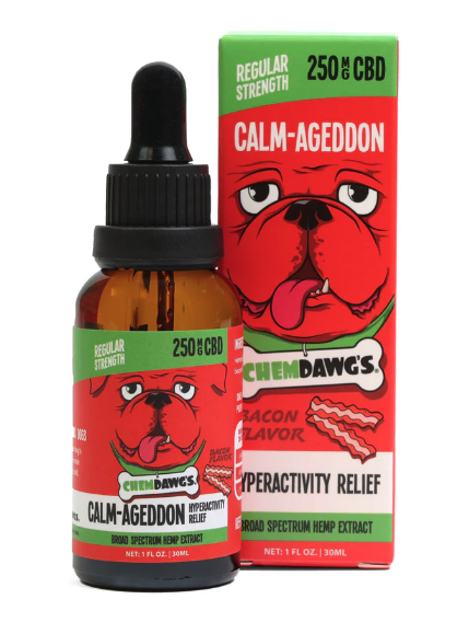 CHEMDAWG’S CBD Calm-Ageddon Pet Tincture contains 250mg of broad spectrum CBD per regular strength bottle and 500mg of broad spectrum CBD per double strength bottle. This bacon-flavored tincture is made with powerful ingredients like hemp seed oil and CBD. With this tincture, you can incorporate CBD into your dog’s daily routine which may provide feelings of calmness, reduce inflammation, and contribute to their overall wellness. Choose from two different strengths to achieve the desired effects for your pet.