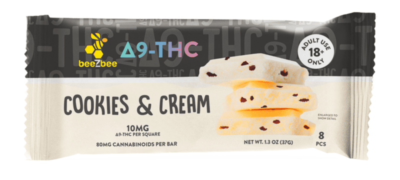 Our Delta-9 THC Cookies & Cream Chocolate Bar blends together white chocolate and cookie flavors in delicious harmony. Each bar contains 80mg of cannabinoids, with 10mg of Delta-9 THC per chocolate square. This chocolate is psychotropic, meaning it has the ability to alter one’s mood, behavior, or perception. Delta-9 THC may provide feelings of light euphoria, relaxation, and a mood boost.